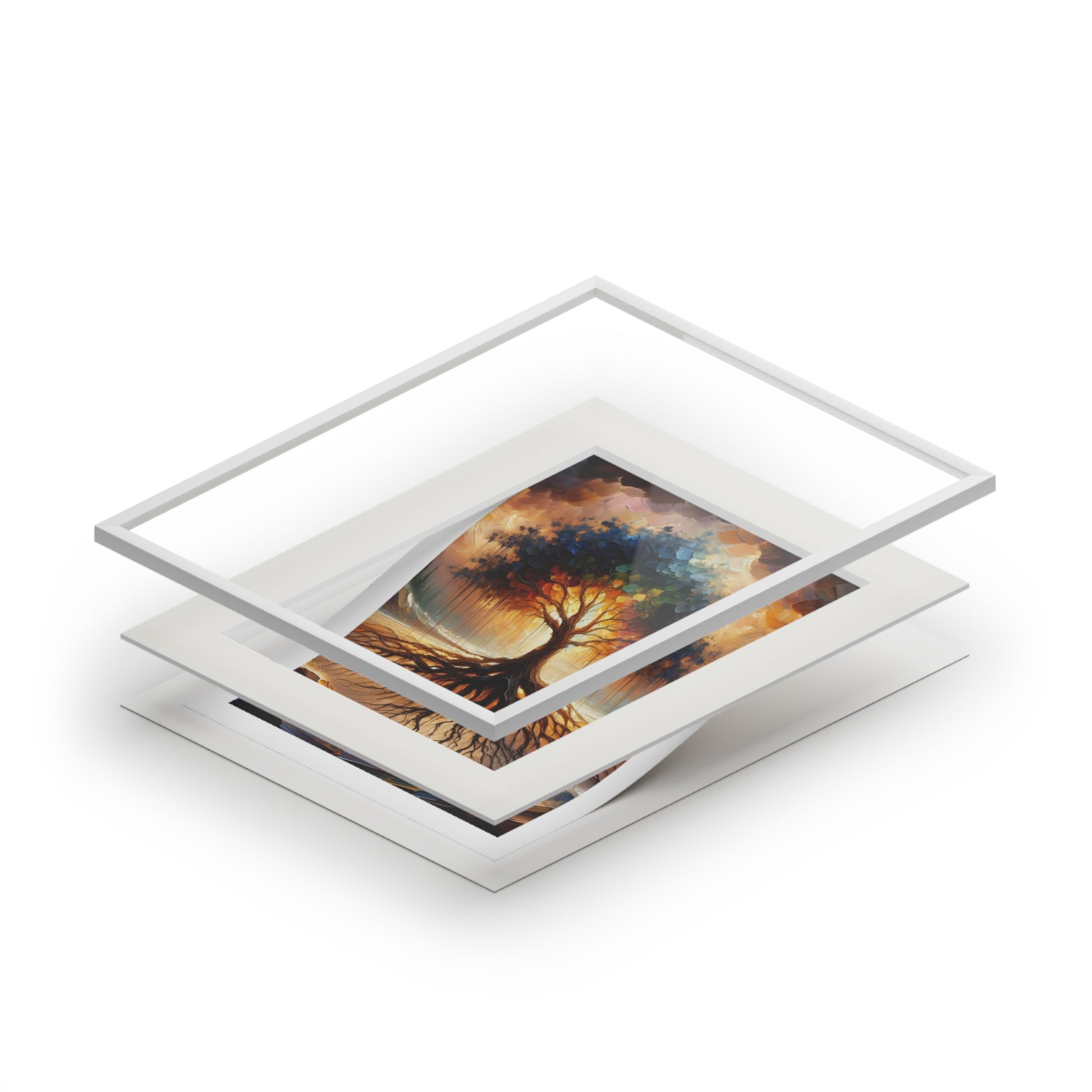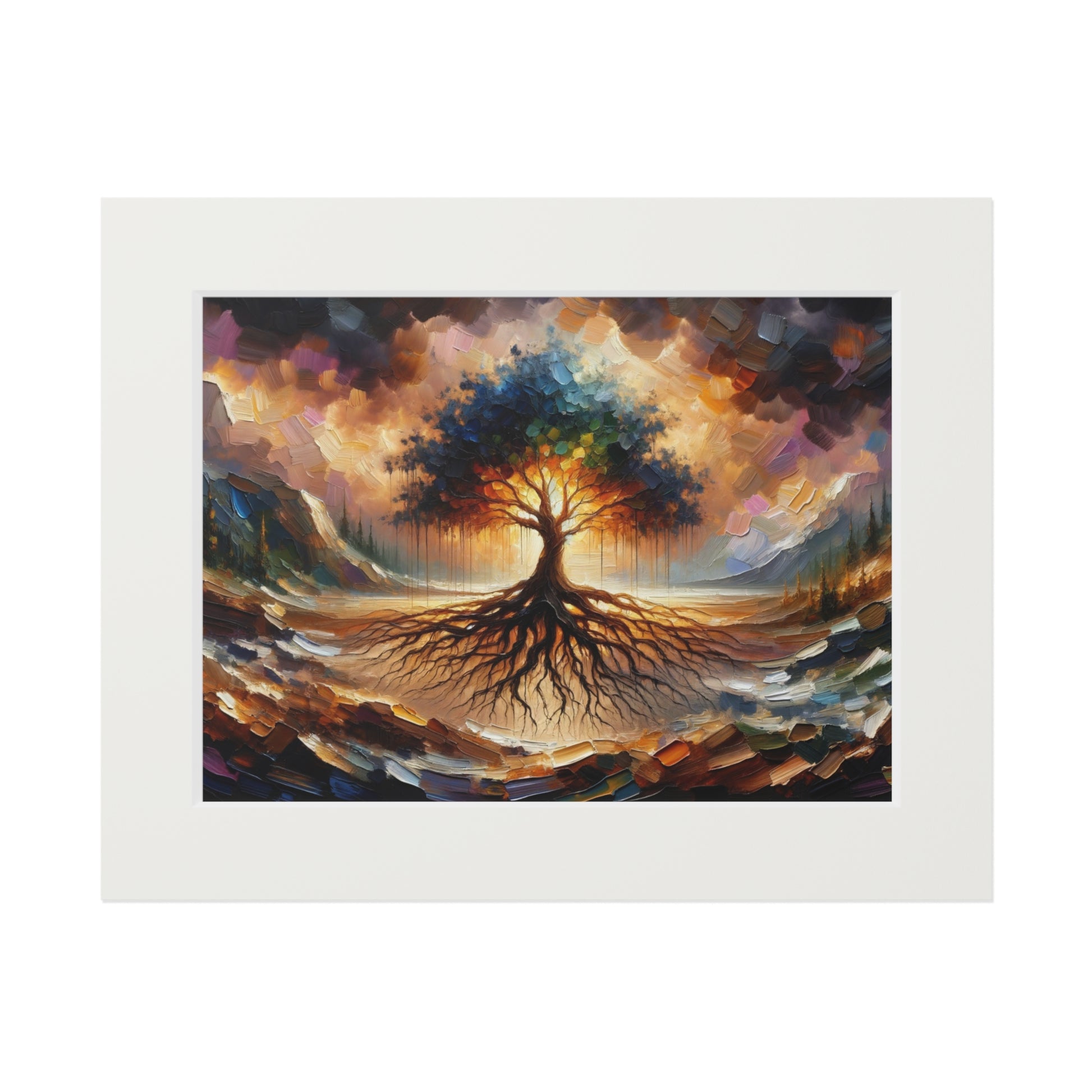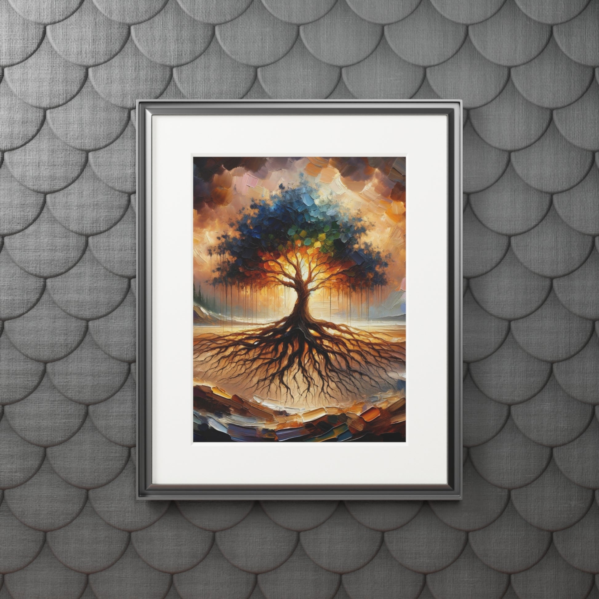 At the heart of the painting stands a magnificent tree, its roots stretching deep into the earth while its branches reach toward heaven. Bathed in divine light and surrounded by a storm of color, it symbolizes how faith, though invisible, sustains us through every trial. The interplay of warm golds, rich browns, and soft blues reflects both the turbulence and peace of a believer’s journey — grounded in trust, lifted by grace.