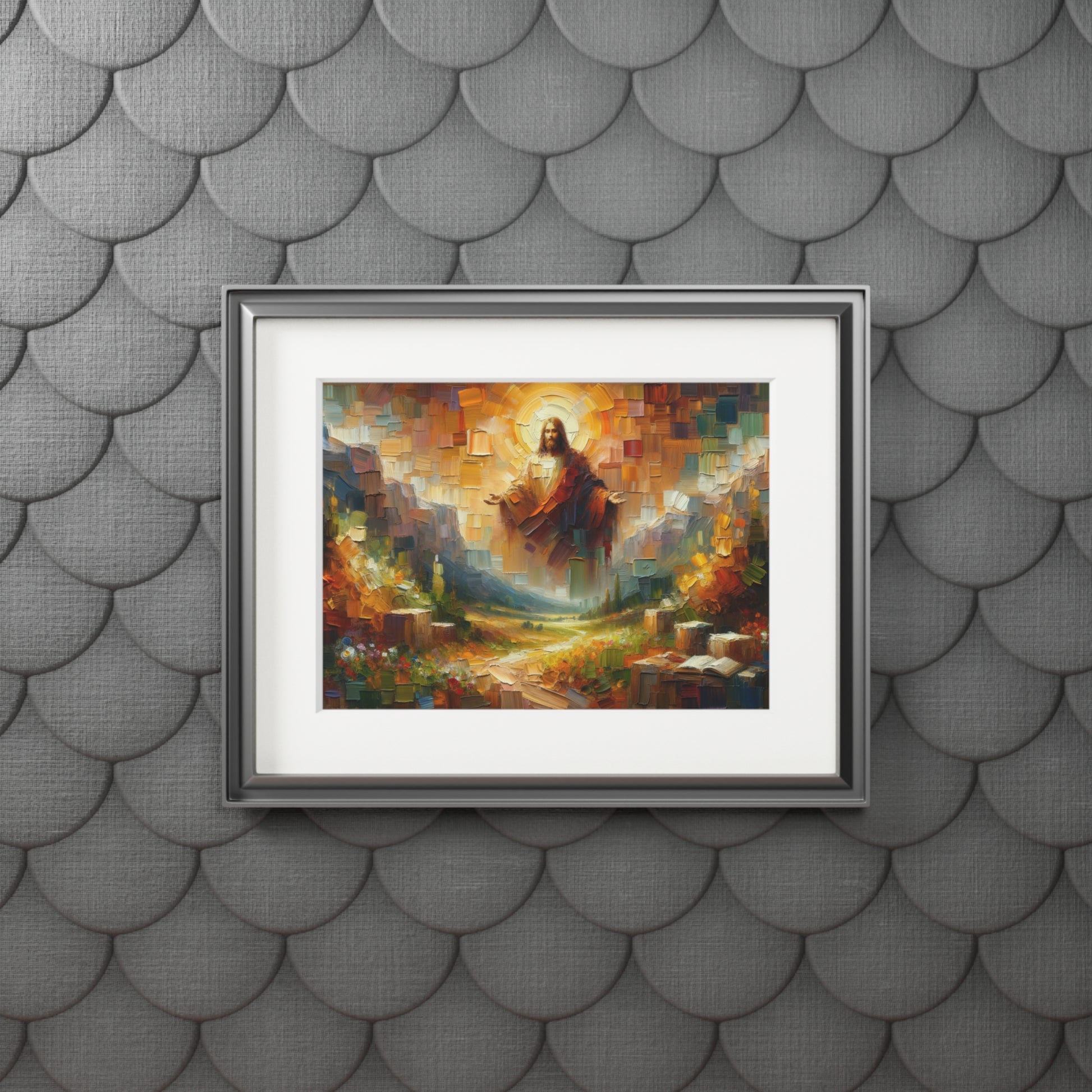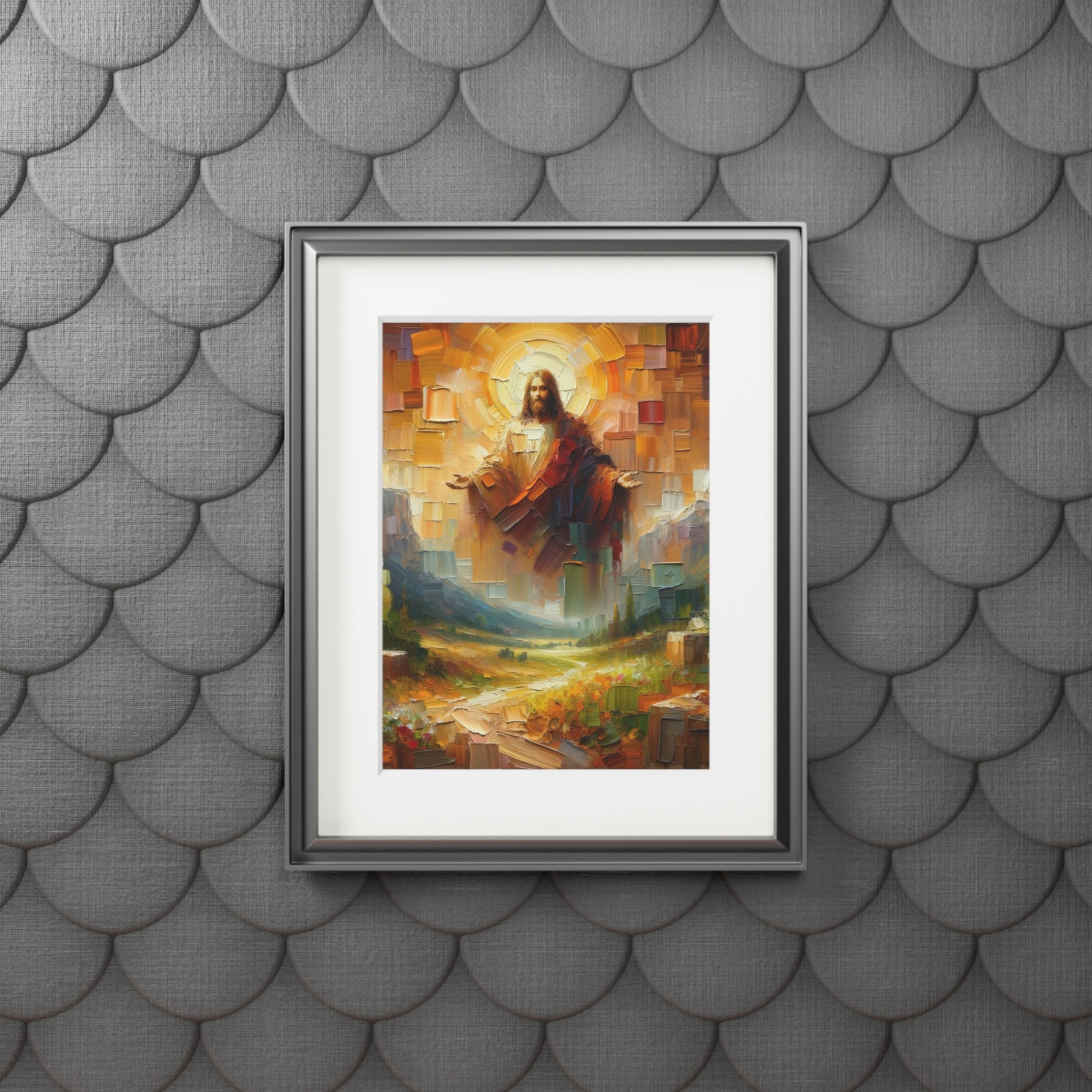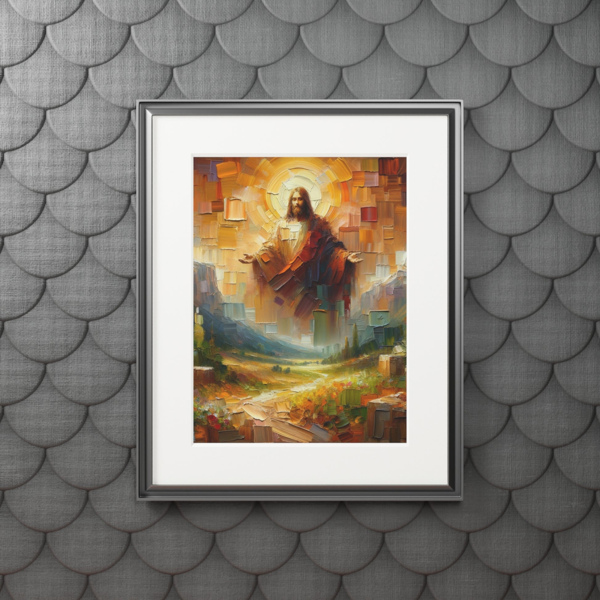 Set against a radiant mountain landscape, Jesus stands at the heart of golden light — His presence both commanding and tender. The geometric brushwork glows with earthy oranges, cool blues, and warm ambers, symbolizing the complexity of human emotion met with divine clarity. This piece invites viewers to rest in the peace of being fully seen, fully known, and fully loved.