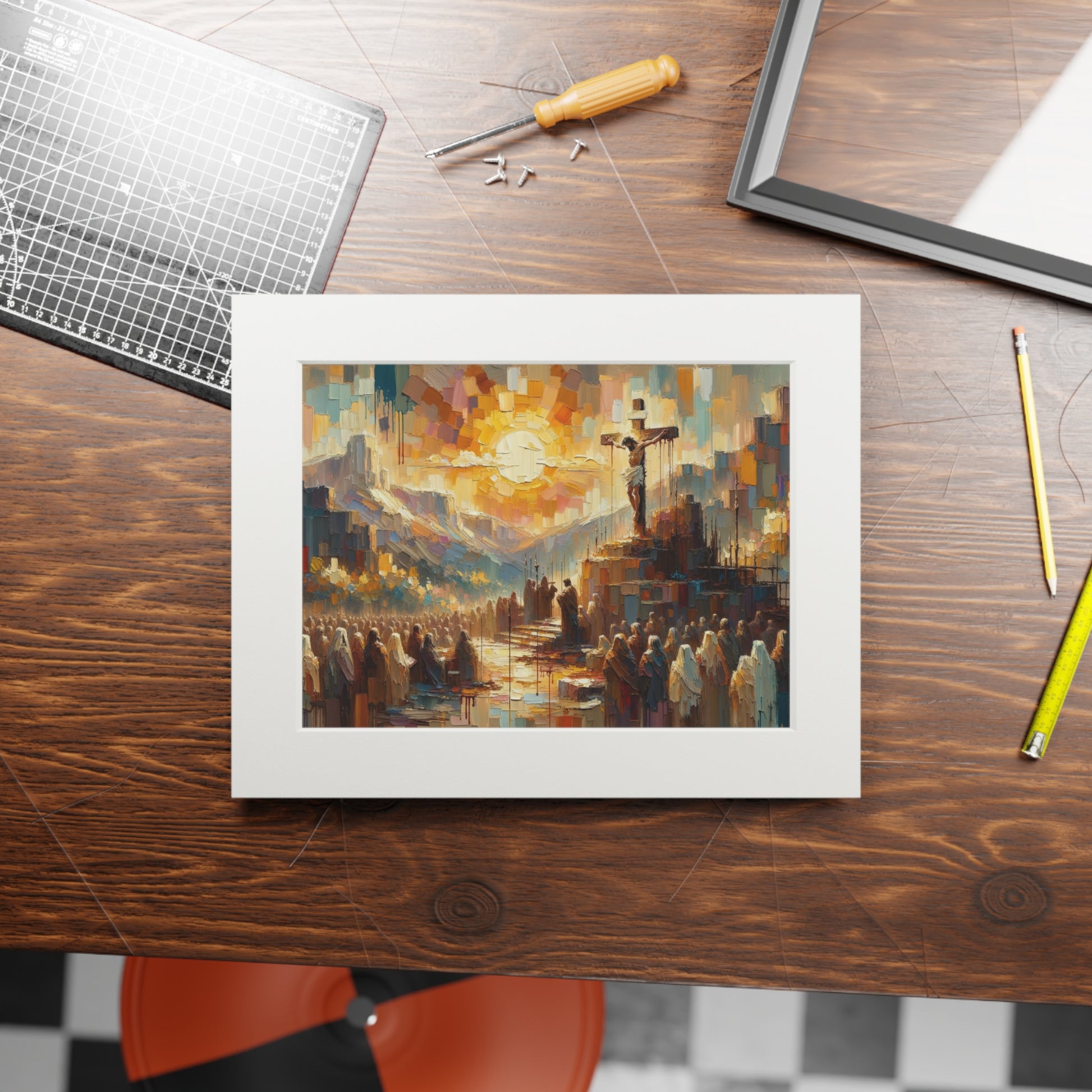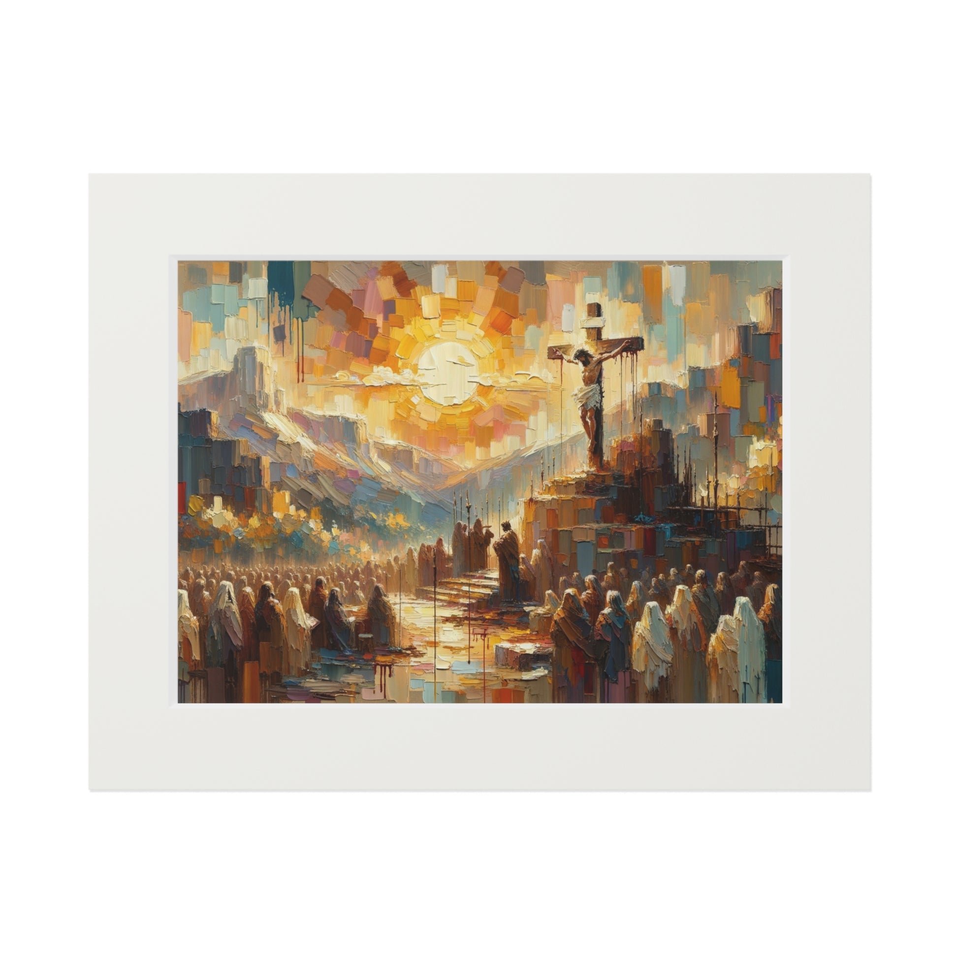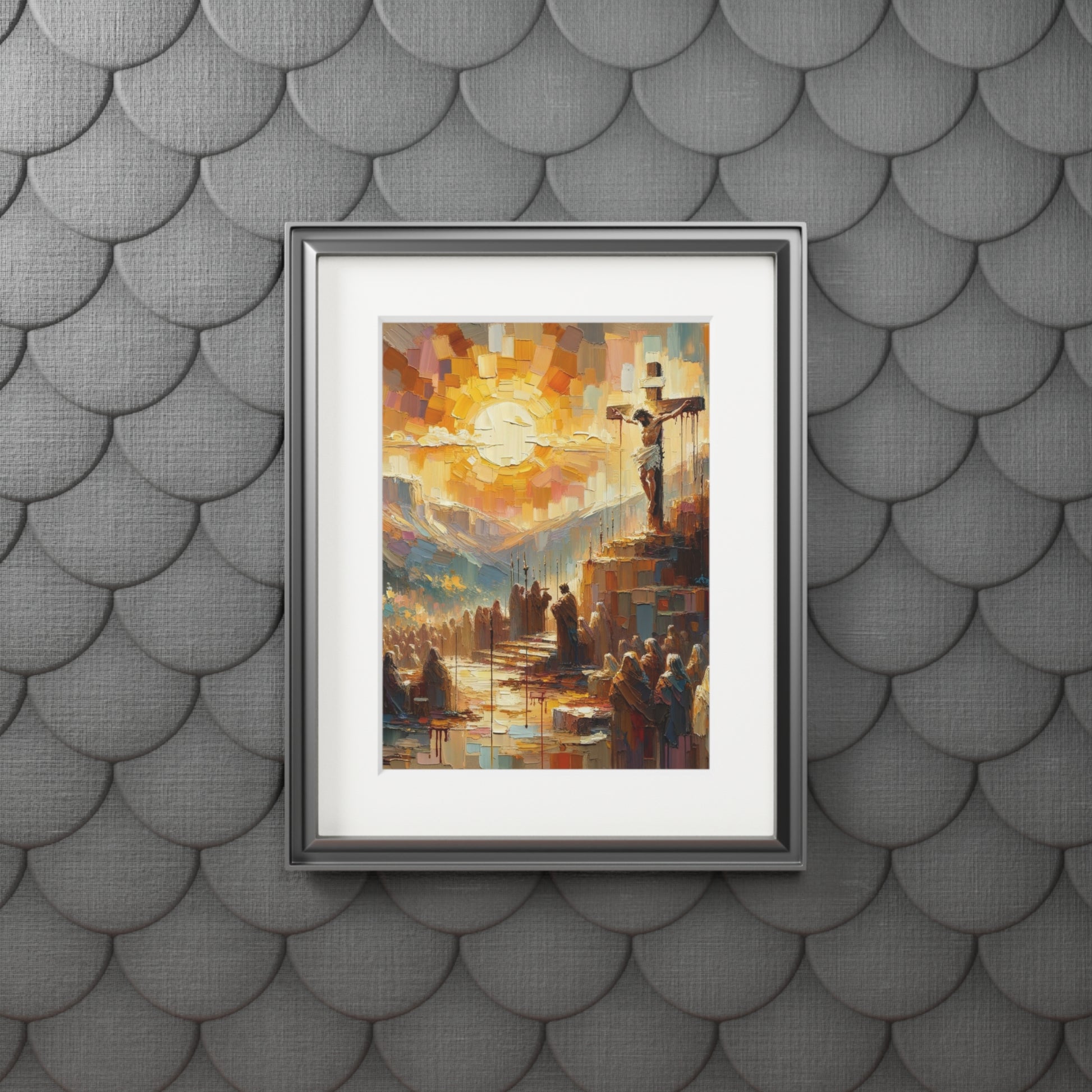Set against a radiant sunrise, the artwork captures the moment of divine love revealed through the cross. Warm hues of gold, amber, and rose intermingle with deep blues and violets, symbolizing both suffering and eternal hope. The gathered figures below gaze upward in awe, witnessing the light of salvation breaking through darkness. Every textured brushstroke invites reflection on the immeasurable love that meets us where we are — imperfect yet infinitely cherished.