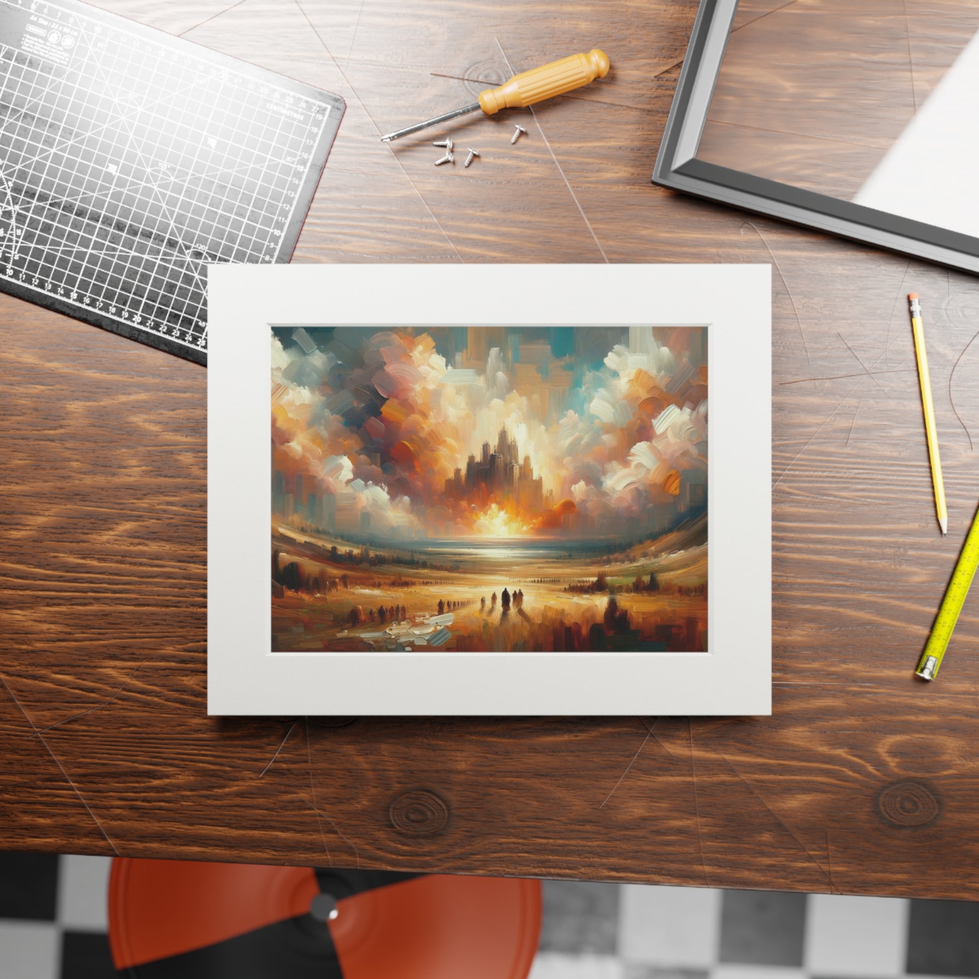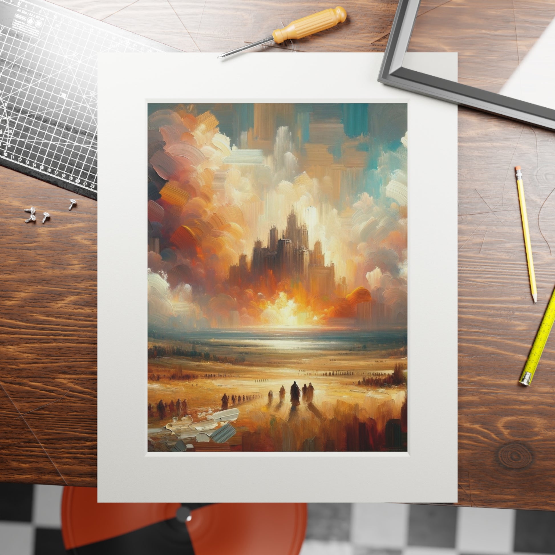 This heavenly oil-textured painting captures the majesty of the Kingdom of Heaven breaking through the clouds—a celestial city bathed in radiant light, rising above a golden valley where pilgrims journey toward its brilliance. Thick impasto strokes in amber, cream, and coral illuminate the landscape, symbolizing faith’s quiet ascent toward divine truth.
