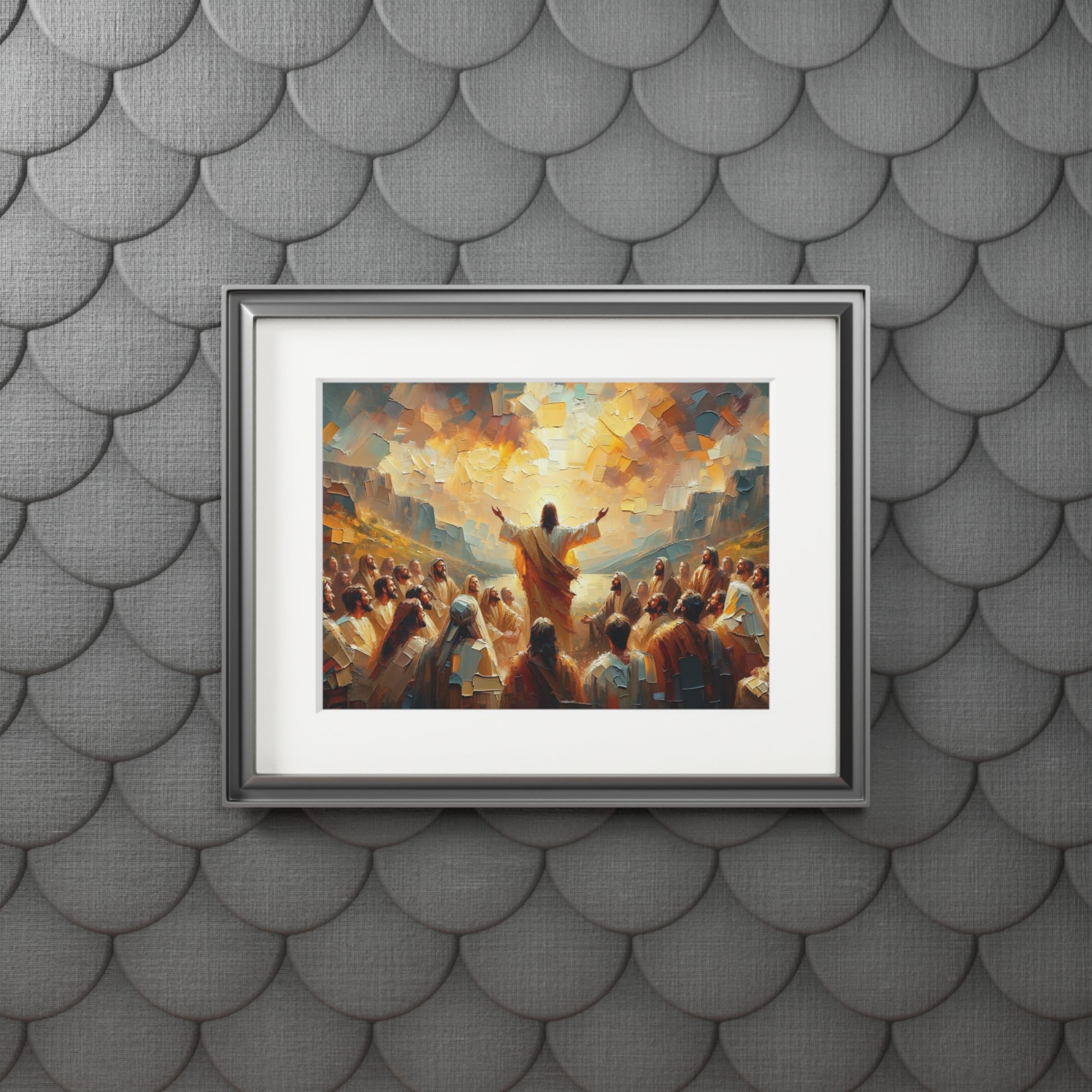 This breathtaking oil-textured painting captures the moment of divine recognition—Jesus standing in golden light, surrounded by His disciples in awe. Every impasto stroke swirls with warmth and revelation, blending gold, amber, and serene blues to mirror the clarity that comes from faith unveiled.
