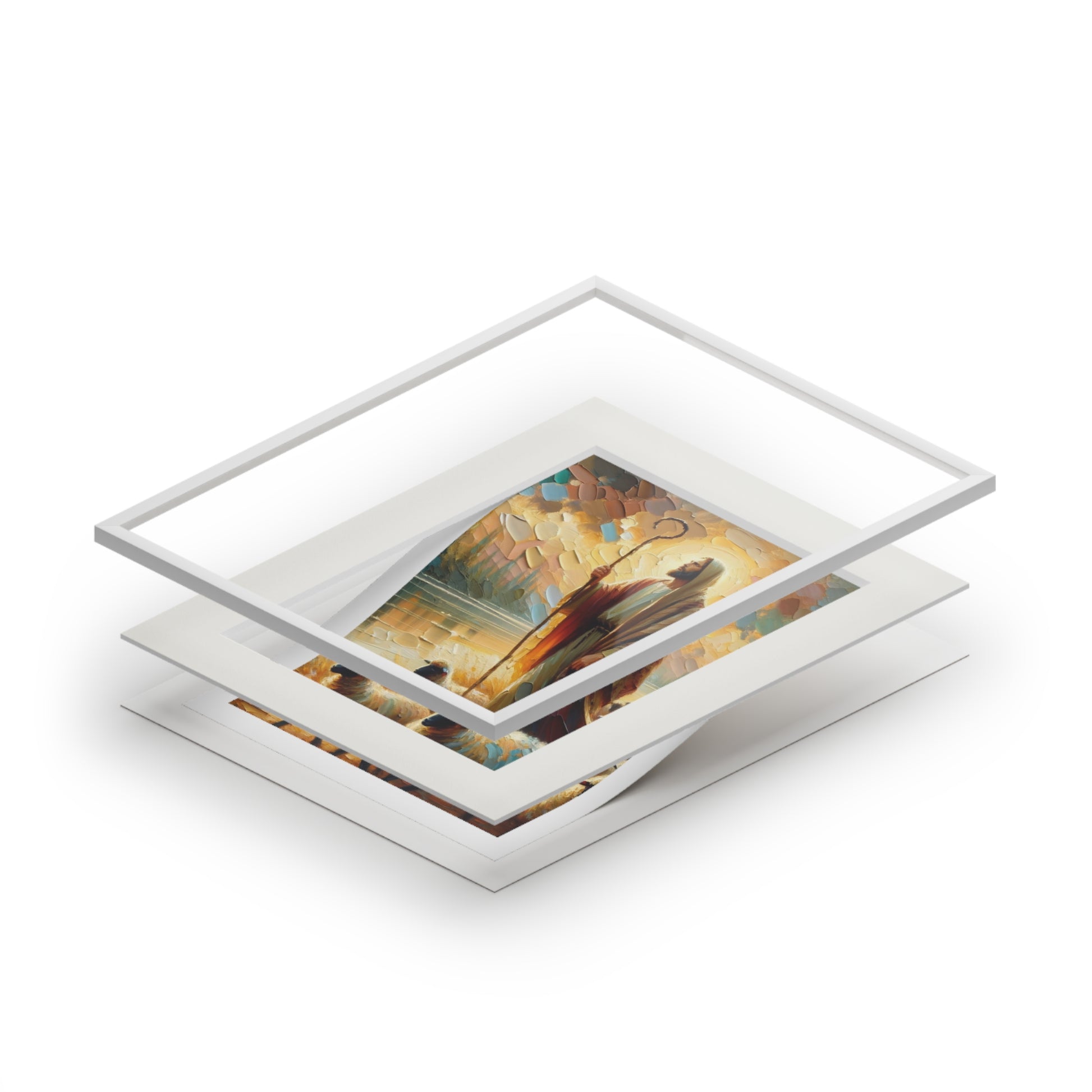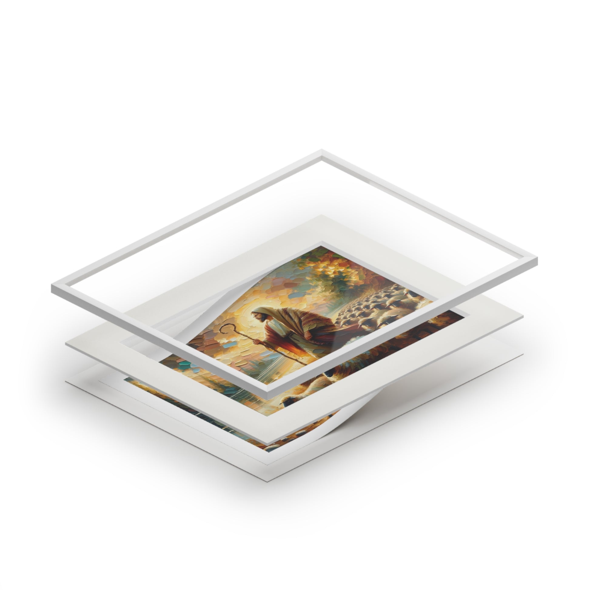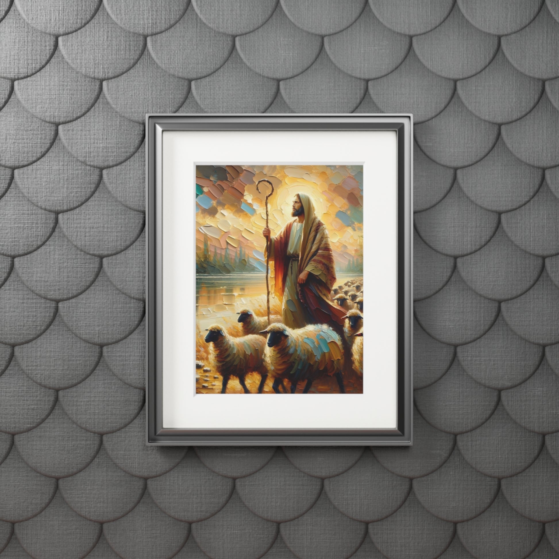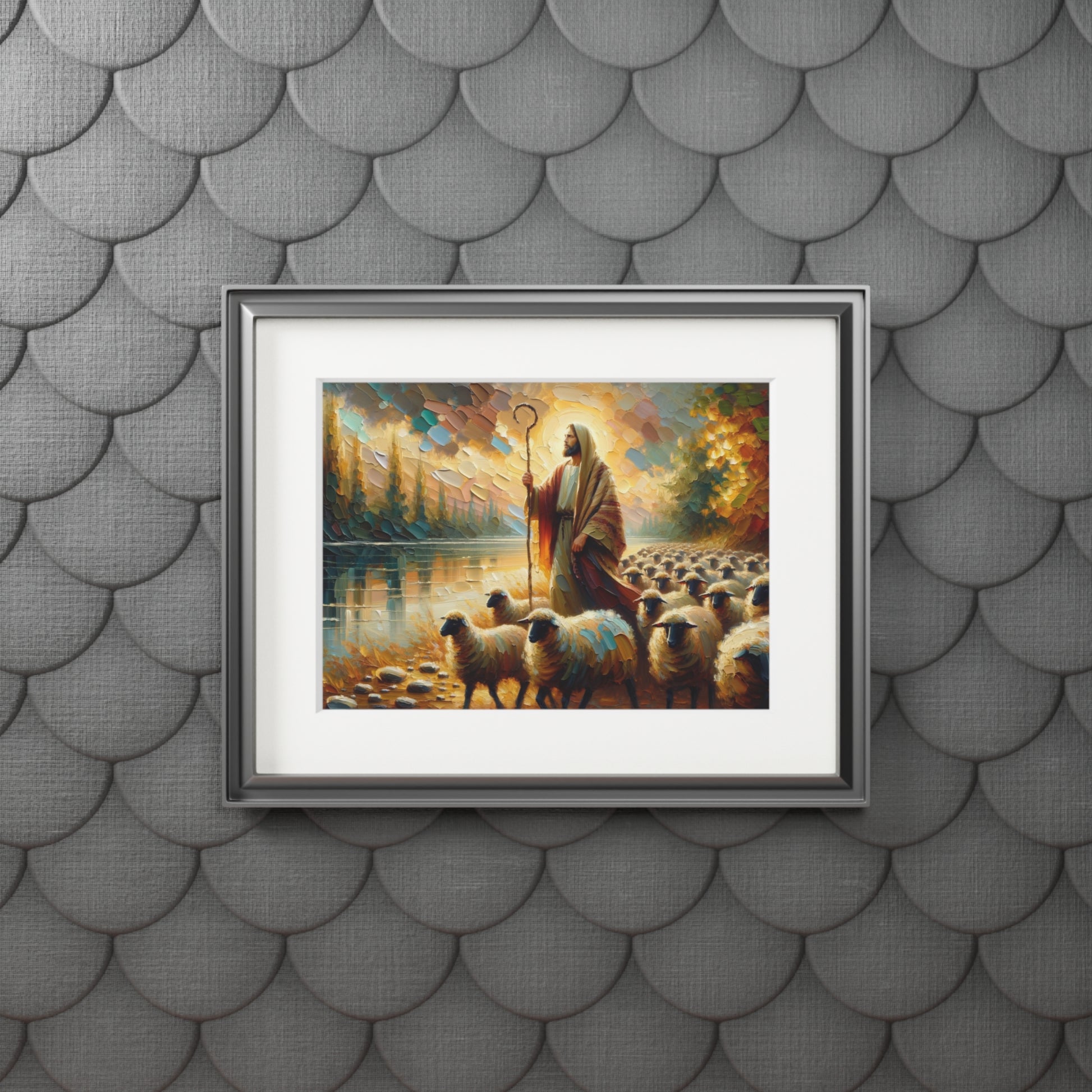 Find comfort and stillness in the presence of divine peace with our breathtaking art print, “The Lord Is My Shepherd.” Inspired by the timeless promise of Psalm 23:1 — “The Lord is my shepherd; I shall not want,” this artwork beautifully portrays Christ as the gentle Shepherd, guiding His flock through golden light and tranquil waters.