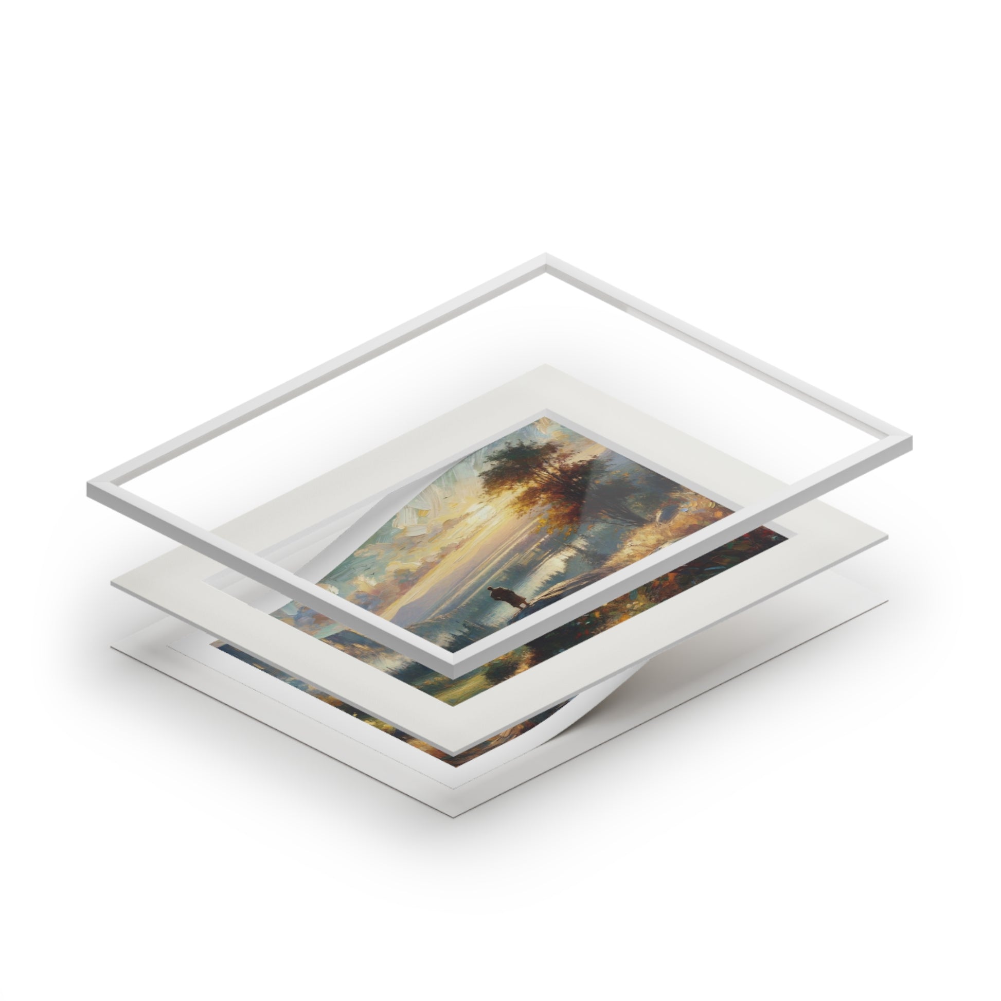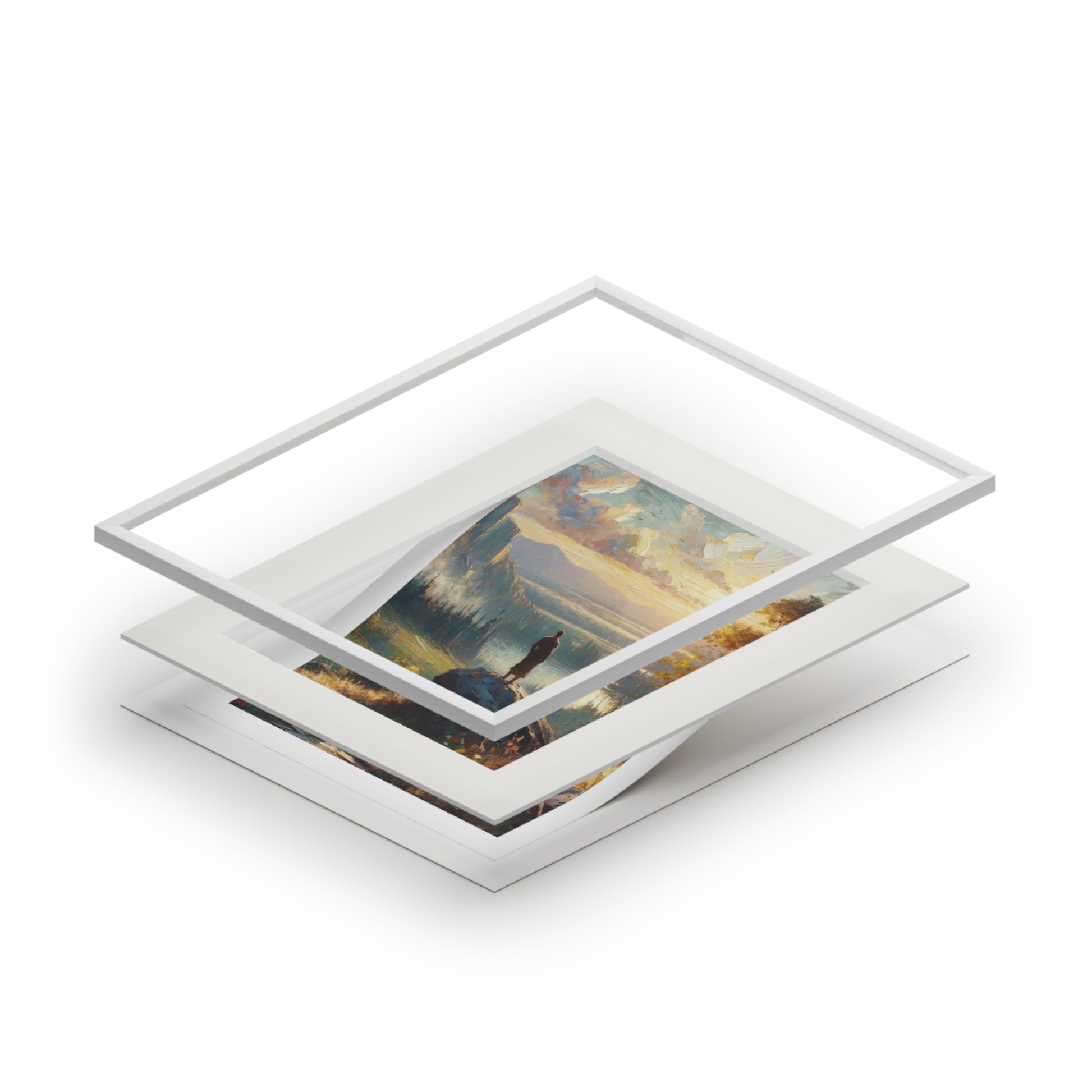 A lone figure stands upon a rock, gazing over a valley bathed in golden light — symbolizing reflection, purpose, and divine perspective. Every brushstroke captures the balance between earthly ambition and spiritual grounding, blending hues of soft amber, misty blues, and autumn gold to evoke a sense of awe and stillness.