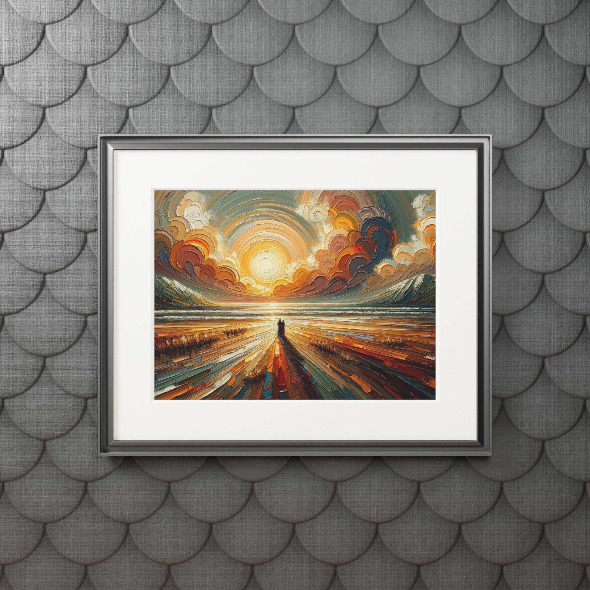 This radiant oil-textured painting captures the transcendent calm of divine peace. Two figures stand side by side, gazing into a sunlit horizon where heaven meets the sea. The swirling impasto brushwork—rich in amber, sapphire, and rose gold—creates a sense of movement that dissolves into serenity, evoking the moment when all anxieties are surrendered to faith.